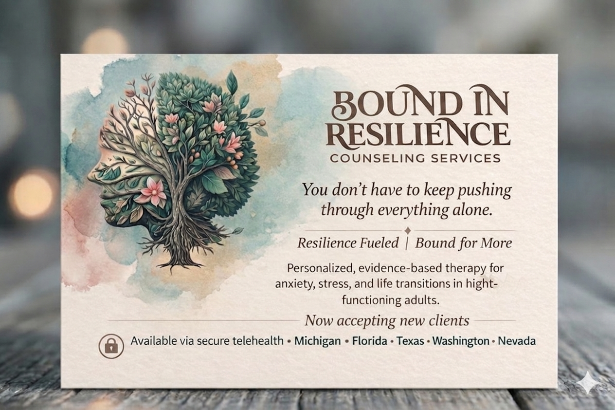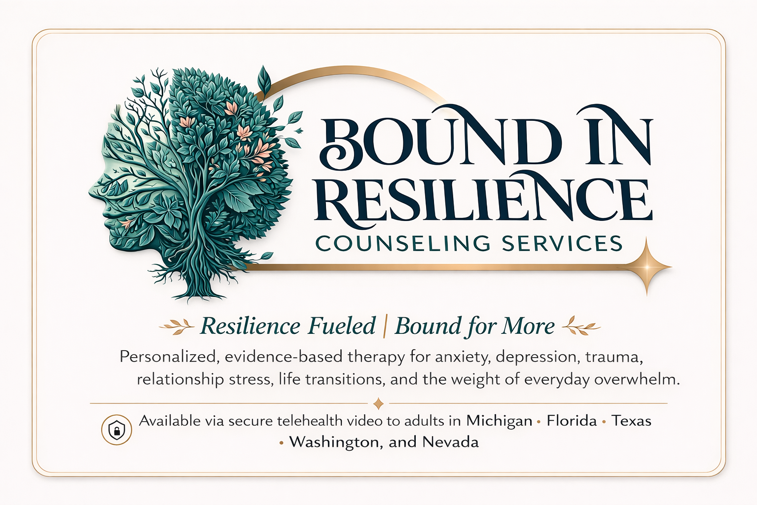 Bound in Resilience Counseling Services provides evidence-based online therapy for adults across Michigan, Florida, Texas, Washington, and Nevada. Our licensed clinicians specialize in:
